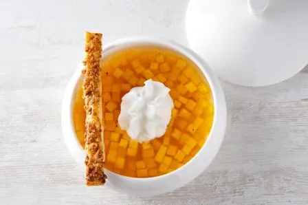 Recette Nage De Mangue Vanillee Emulsion De Champagne Et Croustillant Au Pralin